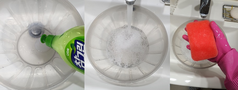 1. 주방세제를 대야에 조금 짜 준 다음 물을 받아주세요.