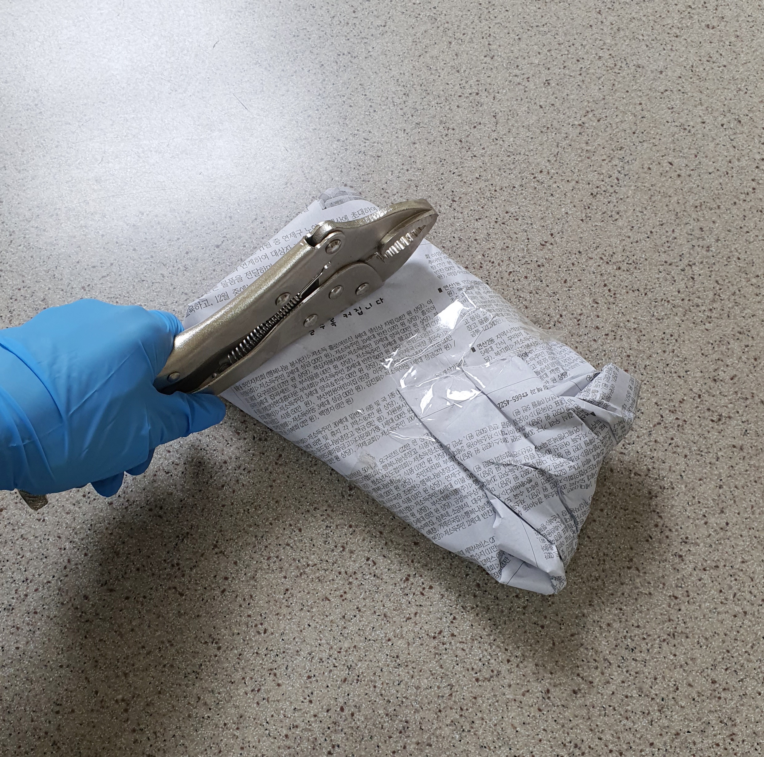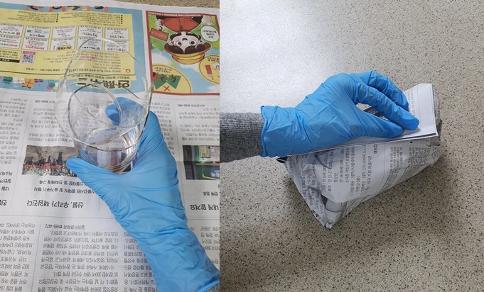 1. 신문지 2~3장 위에 깨진 유리컵을 올려 신문지로 감싸줍니다.