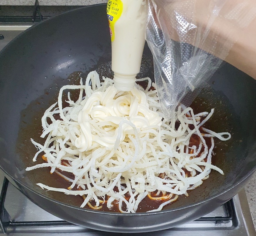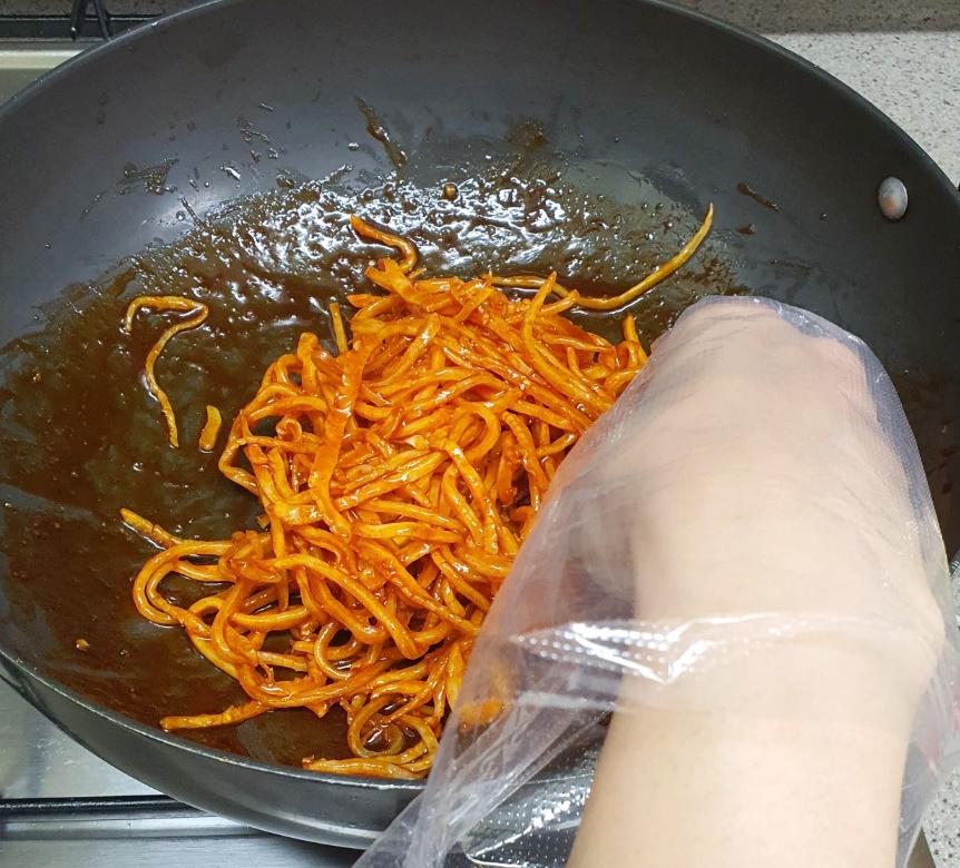 5. 일회용 장갑을 착용해 양념장에 오징어채를 버무립니다.