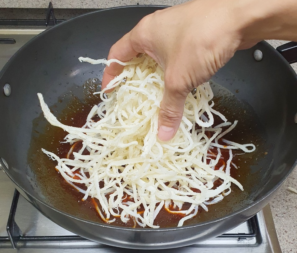 양념장이 따뜻해 오징어채를 물에 불리지 않아도