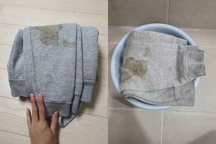 바로 옷에 묻은 얼룩을 제거해 보겠습니다.