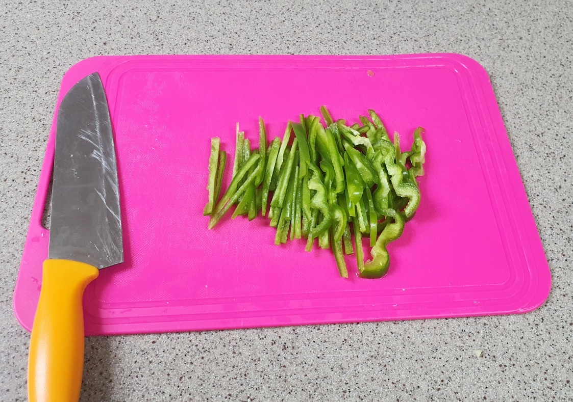2. 그리고 피망을 세로로 세운 다음 칼을 세로로 넣어 잘라주세요.