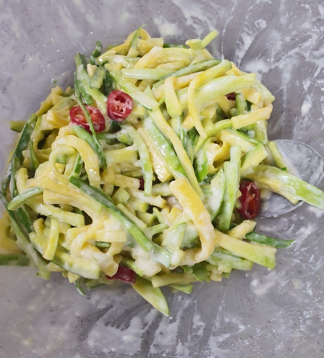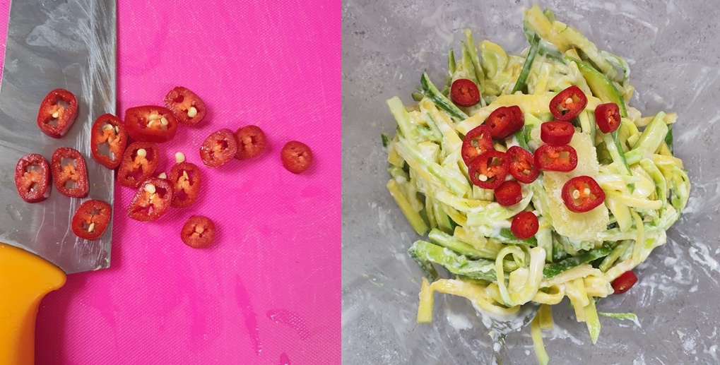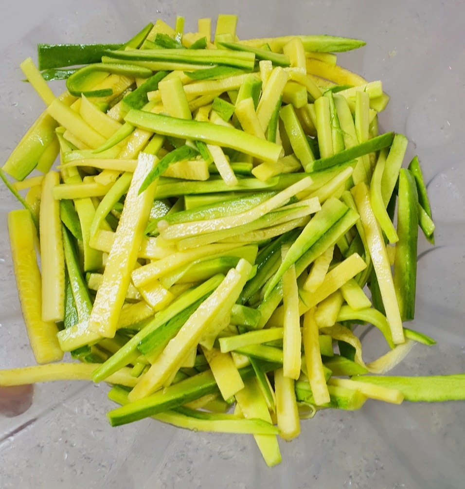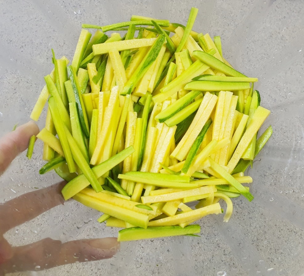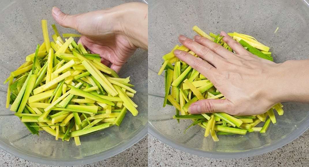 채 썬 애호박은 볼에 담아주세요.