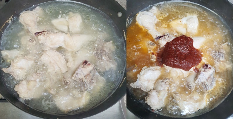 5. 닭이 삶아지면서 올라온 불순물과 기름기를 수저로 떠 냅니다.
