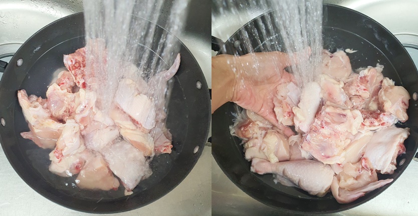 1. 닭을 흐르는 물에 3~4번 씻어주세요.