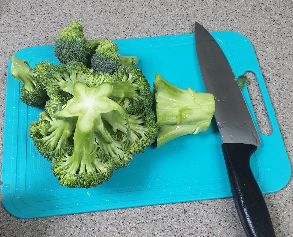 깨끗하게 세척한 브로콜리는 도마에 올려주시고요.