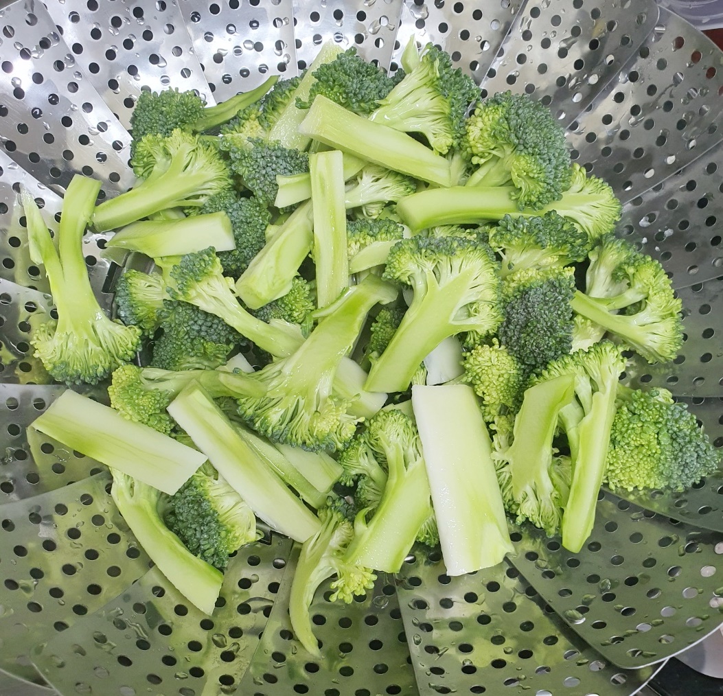 씻은 브로콜리는 채반에 받쳐서 찌기 시작합니다.