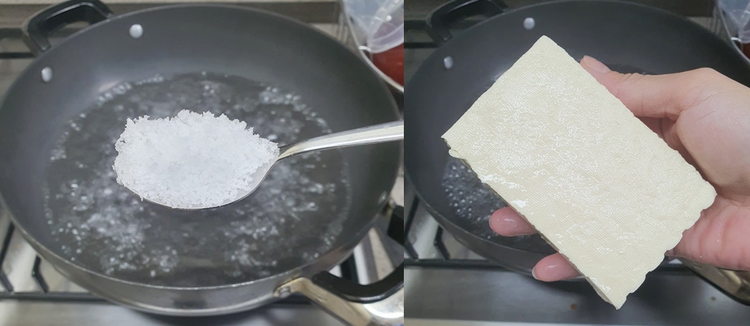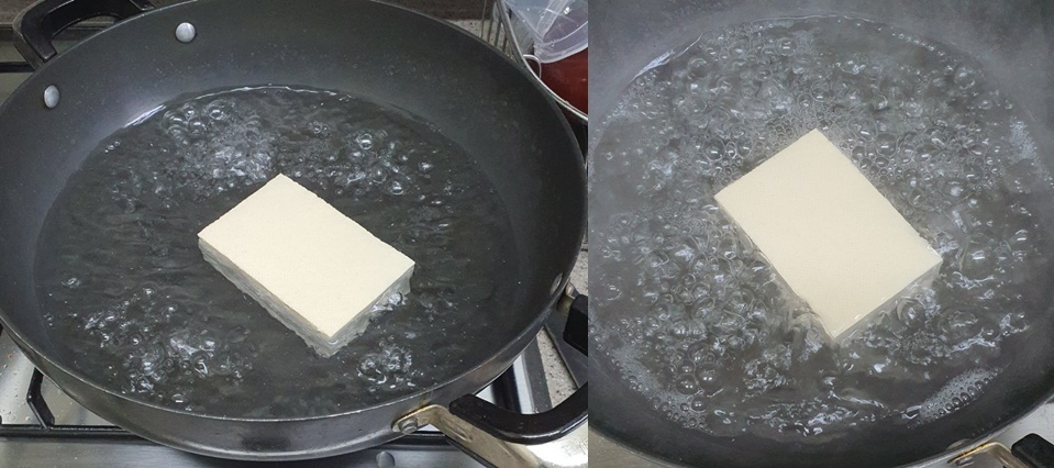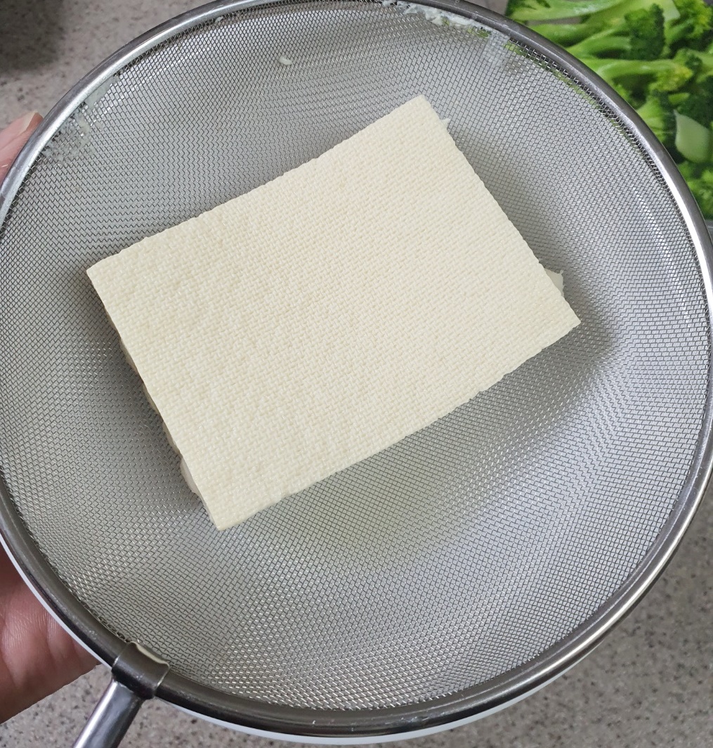 반대편도 15초 익혔다면 채반에 꺼내어 두부에 물기를 빼 줍니다.