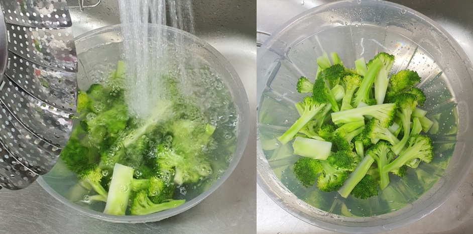 씻은 브로콜리는 채반에 받쳐서 찌기 시작합니다.