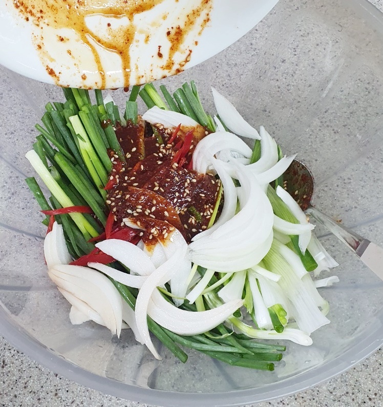 그리고 만든 양념장을 쪽파에 부어주시고요.