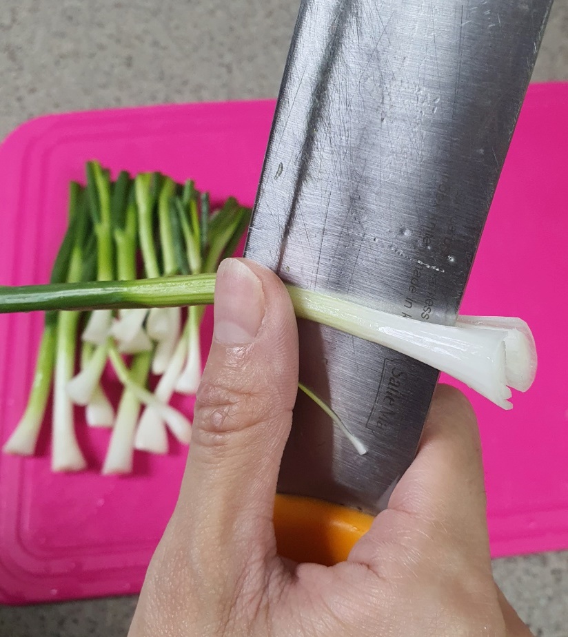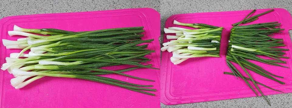 쪽파를 도마에 올려 반 잘라주시고요.