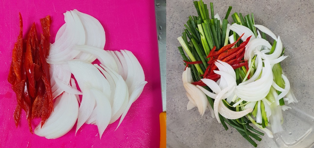 양파 1/4개와 홍고추 반 개를 채 썰어