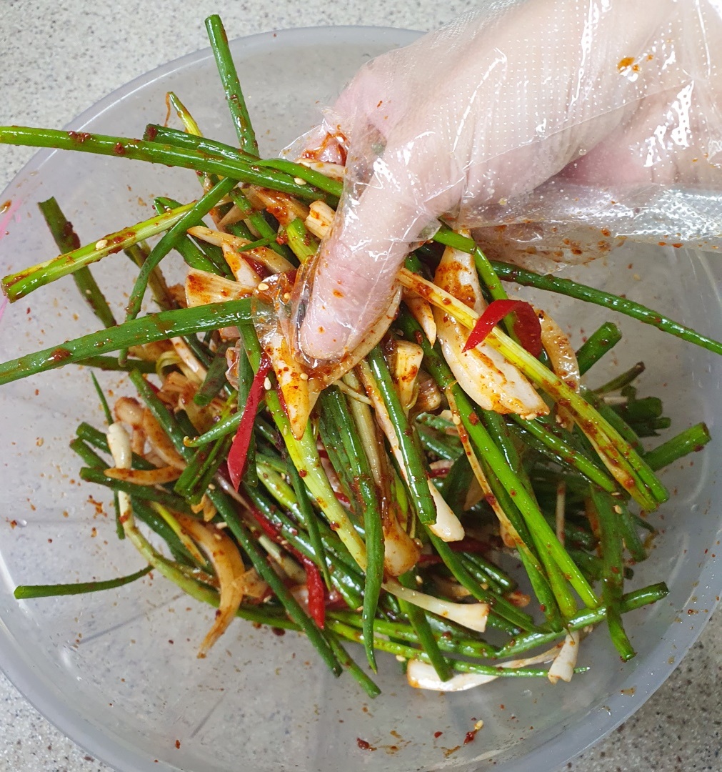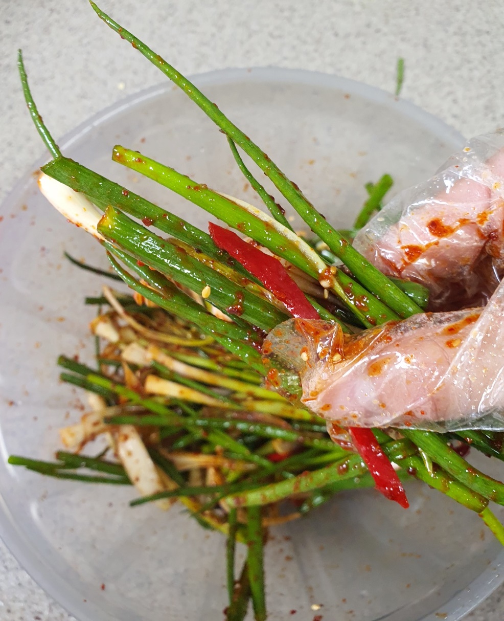 그리고 만든 양념장을 쪽파에 부어주시고요.