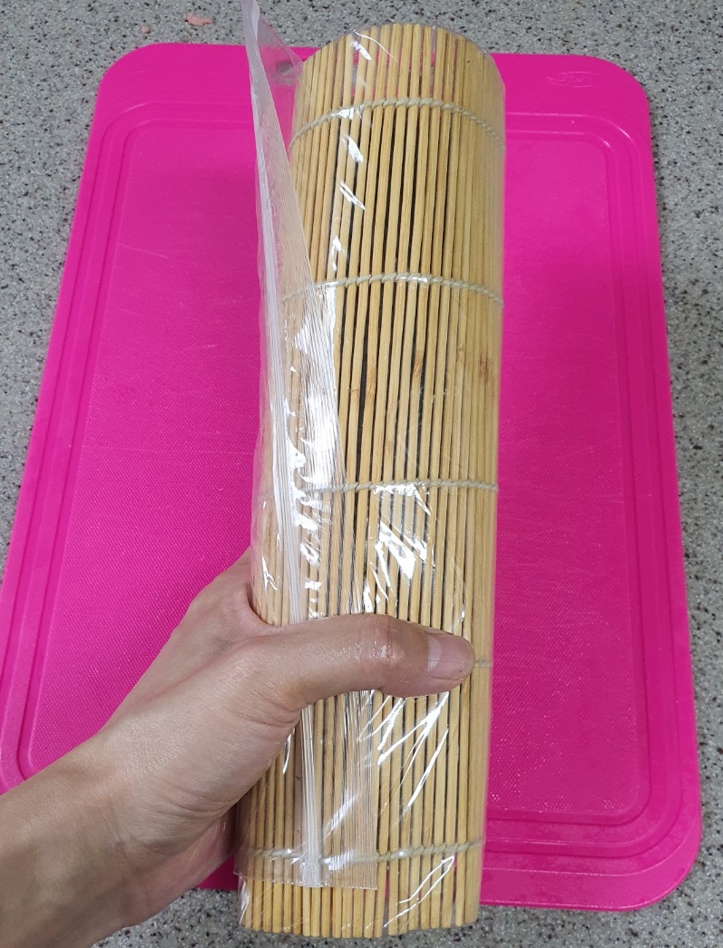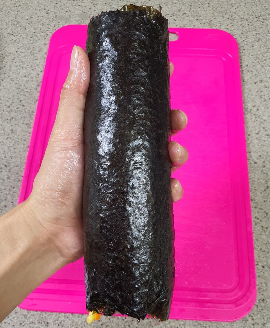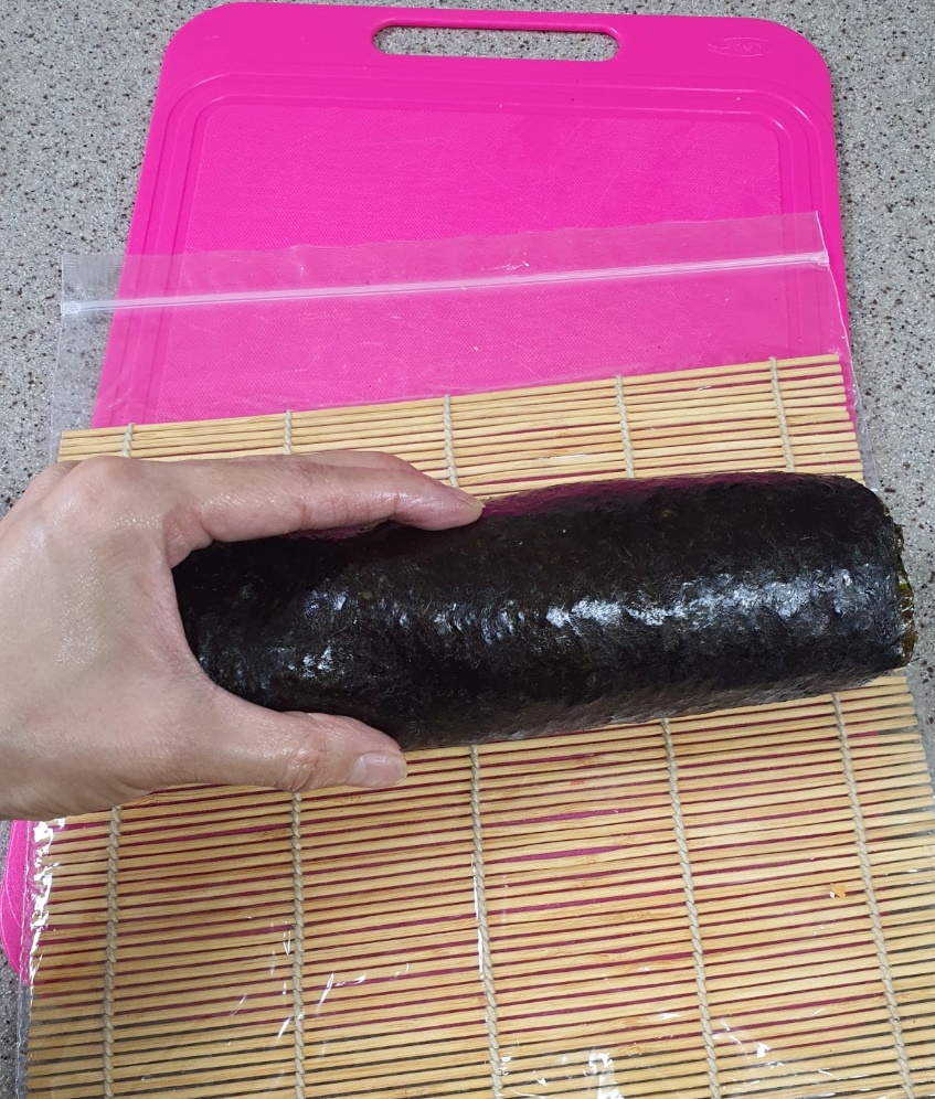 김밥을 다 말았다면 김발에 한번 더 올려 말아주세요.