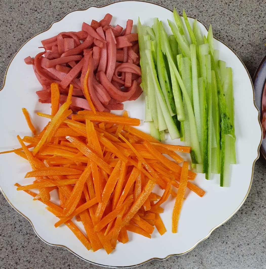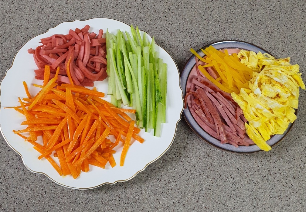 저는 씨를 뺀 오이, 당근, 분홍 소시지, 햄, 단무지, 계란 지단을 준비했습니다.