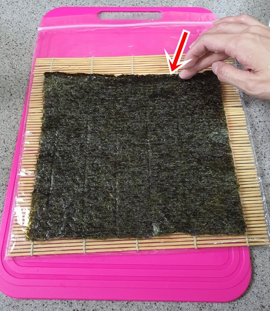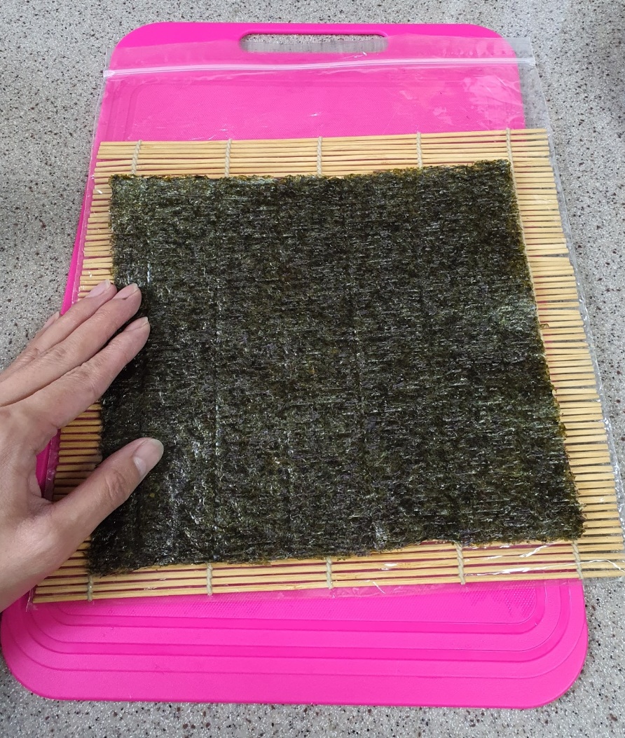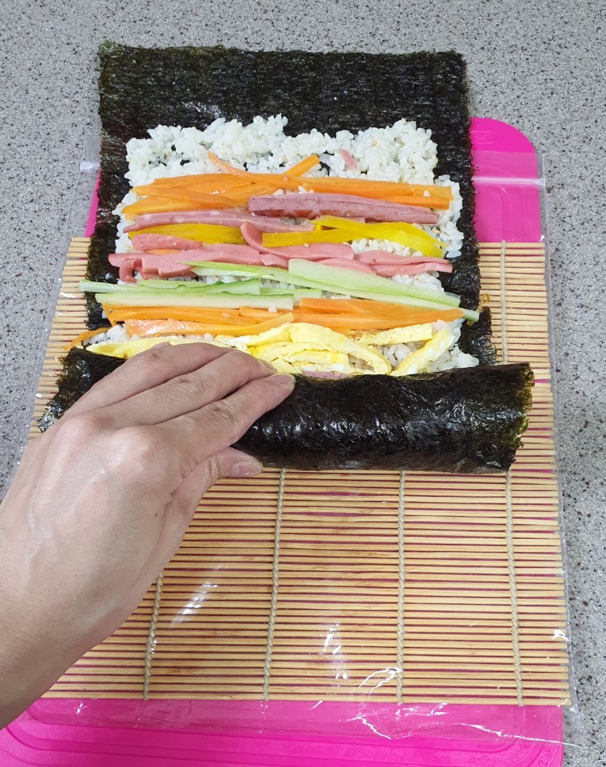 처음에는 김발을 사용하지 않고 김밥을 손으로 말아주세요.