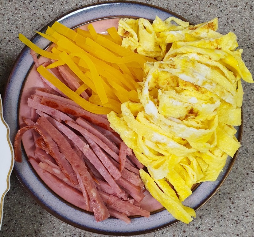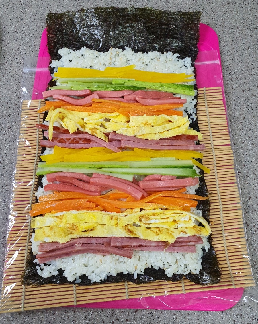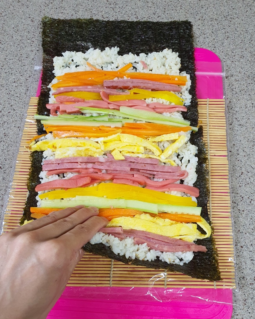 그 위에 햄, 계란, 당근, 분홍소시지, 오이, 단무지 순으로