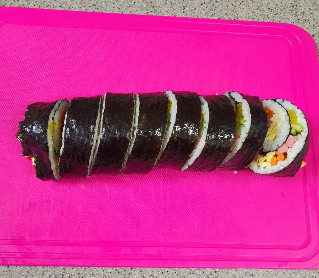 완성된 김밥은 칼로 썰어줍니다.