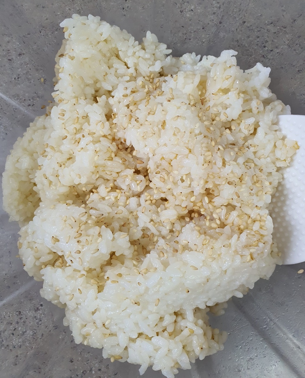 밥에 맛소금, 참기름, 통깨를 넣어 간을 합니다.