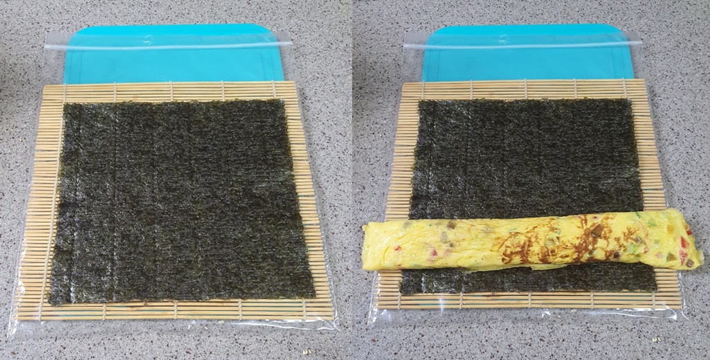 그 위에 김 한 장을 올려 계란말이를 올려줍니다.