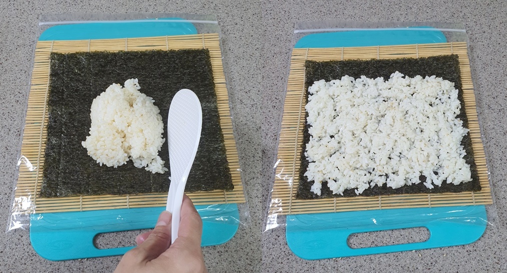 김발 위에 김 한 장을 올려 밥을 넓게 펼쳐줍니다.