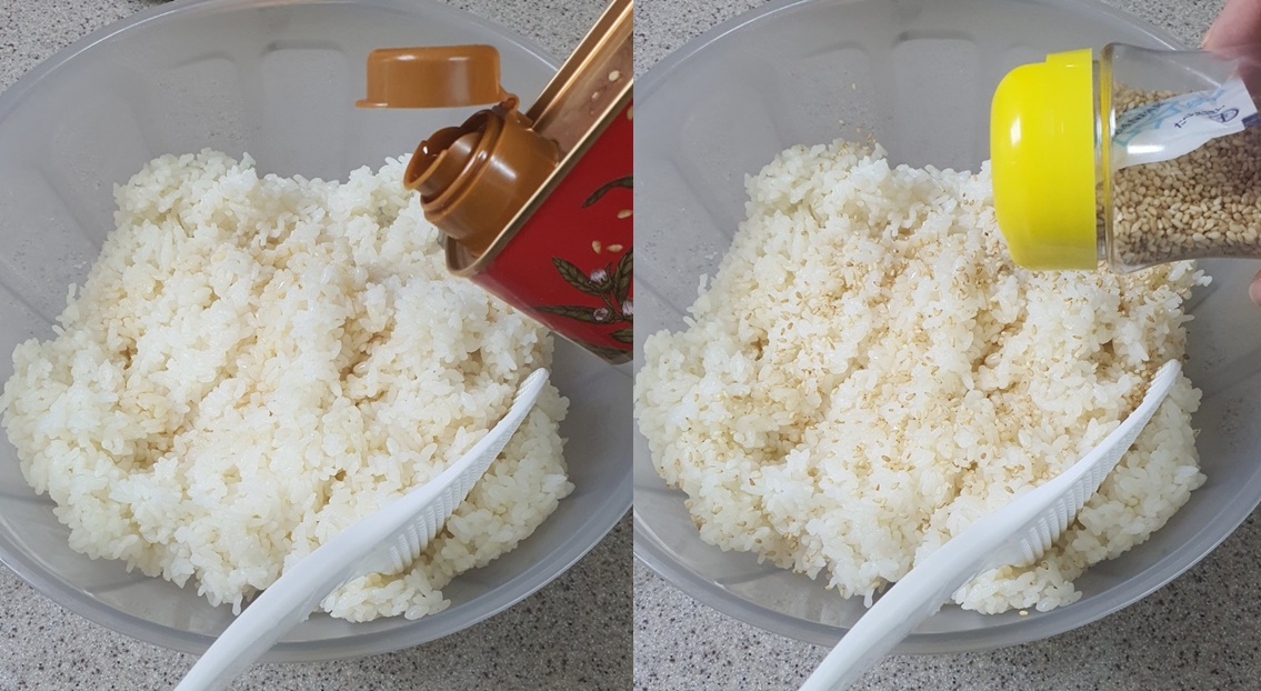 밥에 맛소금, 참기름, 통깨를 넣어 간을 해 주세요.