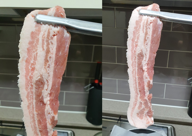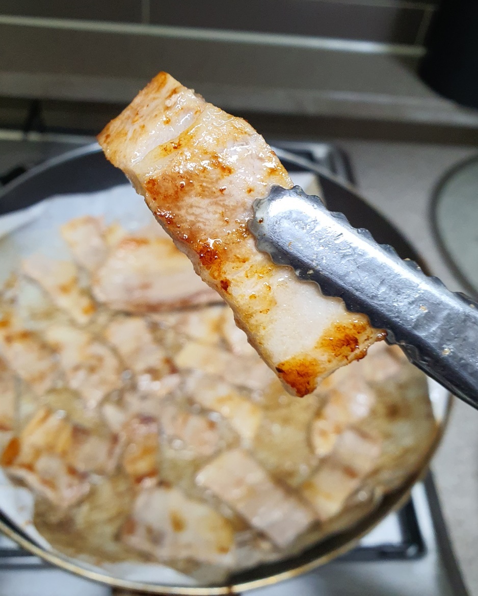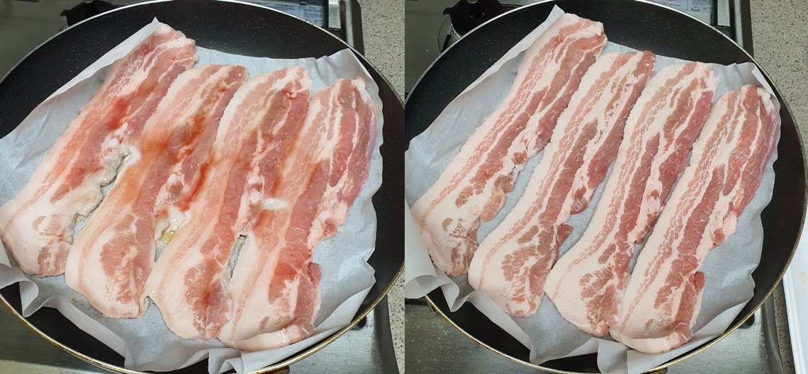 왼쪽은 숙성하지 않은 삼겹살을 구웠을 때 모습입니다.