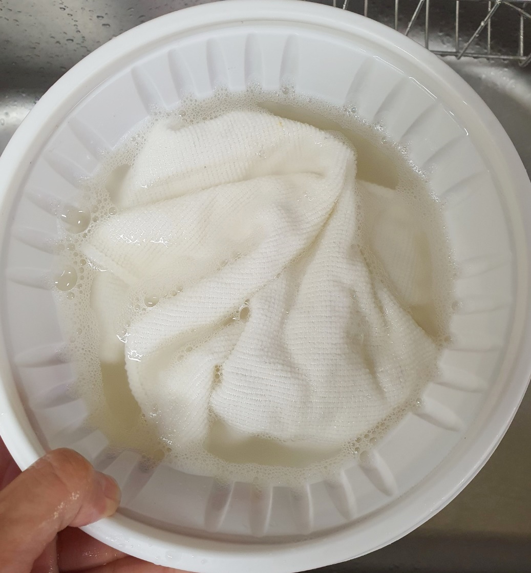 사진을 보시면 동일한 행주라고 생각되지 않을 만큼 새 행주가 된 것을 볼 수 있습니다.