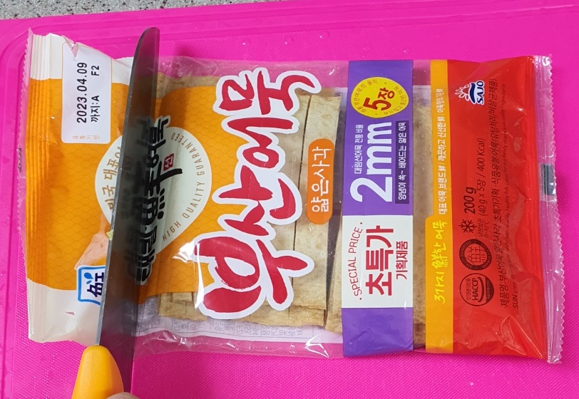 봉지 위에 칼을 대고 한 입 크기로 길쭉길쭉 썰어주세요.