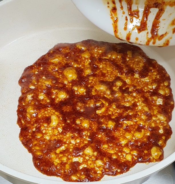 예열된 프라이팬에 기름 2큰술  둘러주고 양념장을 부어줍니다.