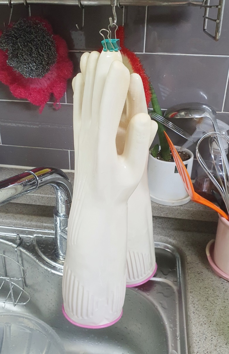 저는 자석철에 집게를 사용해 고무장갑을 걸어 사용하는데요.