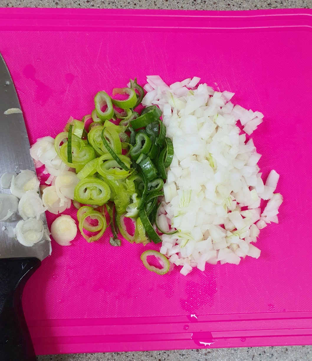 대파는 동그랗게 썰고 양파는 다져서 준비합니다.