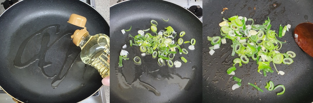 기름 두른 프라이팬에 대파를 먼저 볶아주세요.