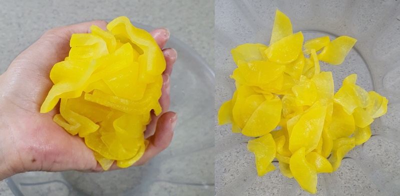 너무 두껍게 썰면 식감이 좋지 않으니 다소 얇은 듯싶게 썰어줍니다.