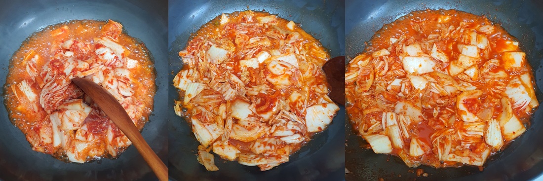 5. 김치를 볶은 다음 멸치 육수를 부어주세요.