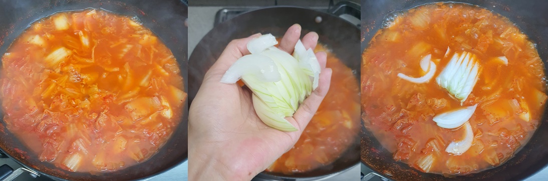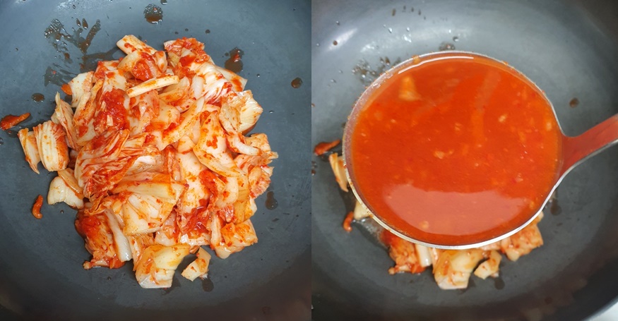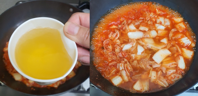 5. 김치를 볶은 다음 멸치 육수를 부어주세요.