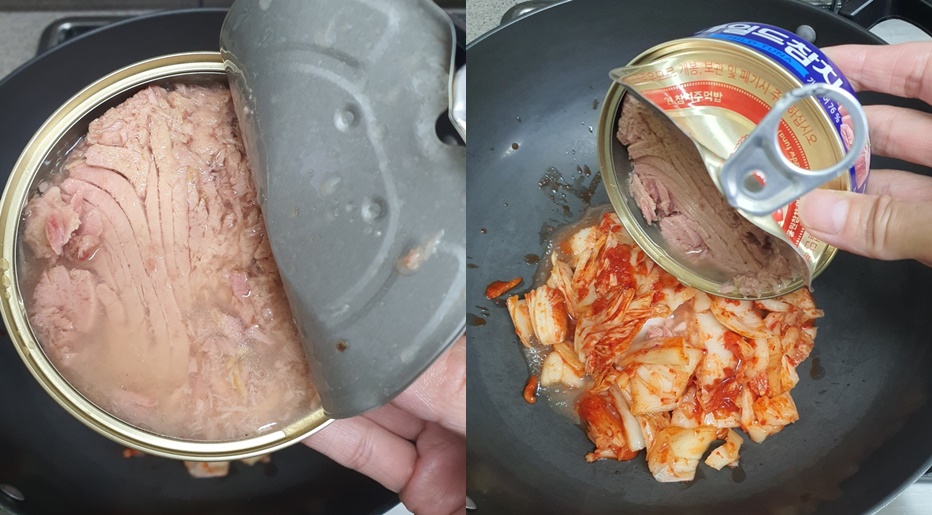 3. 자른 김치에 참치 기름을 모두 부어주세요.