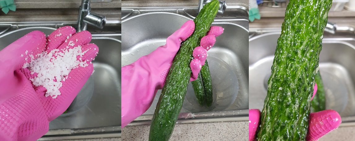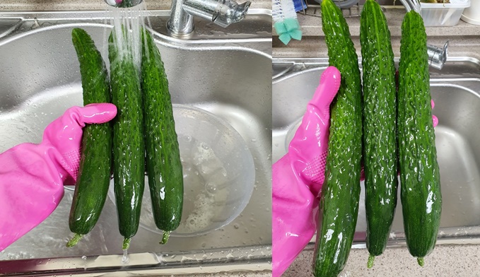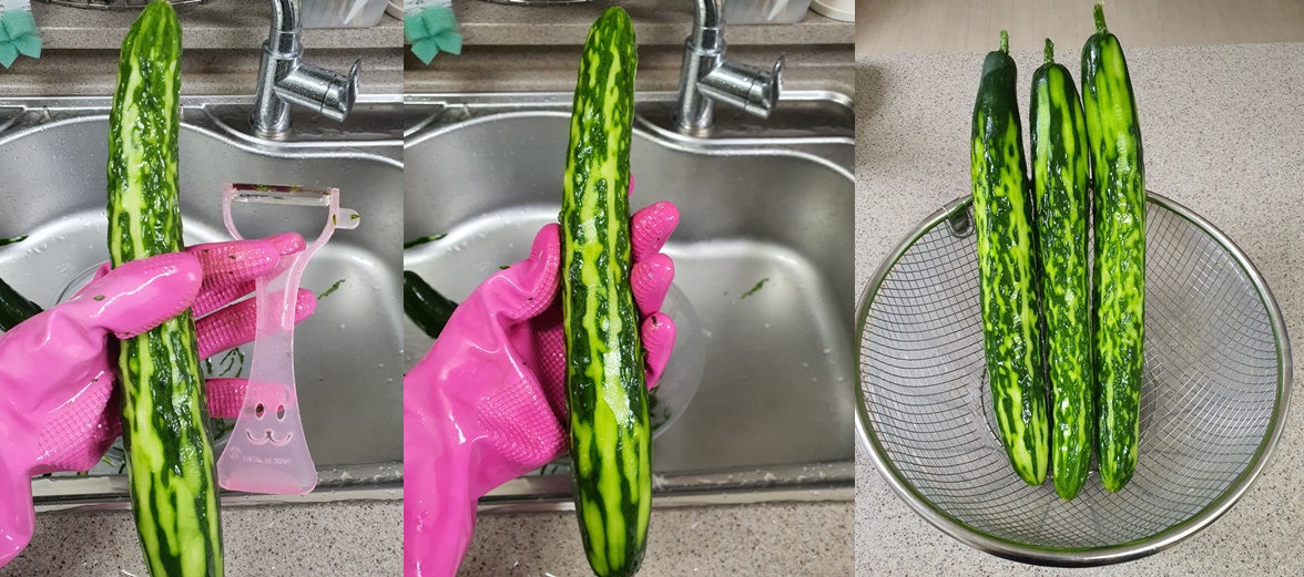 문지른 오이는 깨끗한 물에 헹궈주세요.