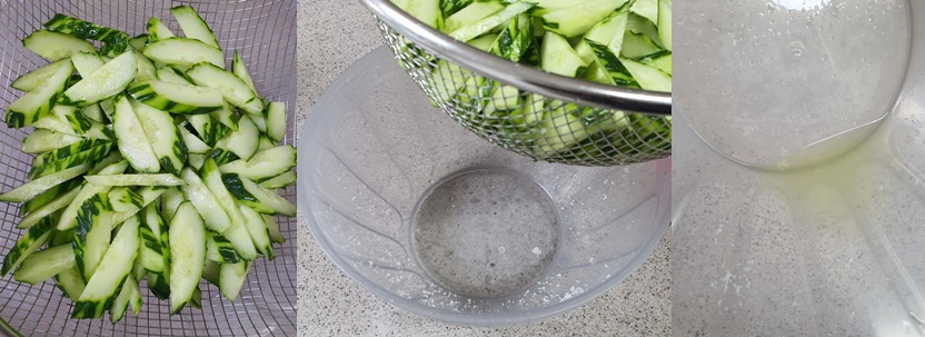 15분 후 오이에서 수분이 빠져나온 것을 볼 수 있는데요.