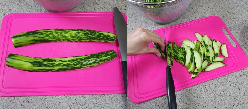오이는 반으로 잘라서 반달모양으로 썰어주세요.