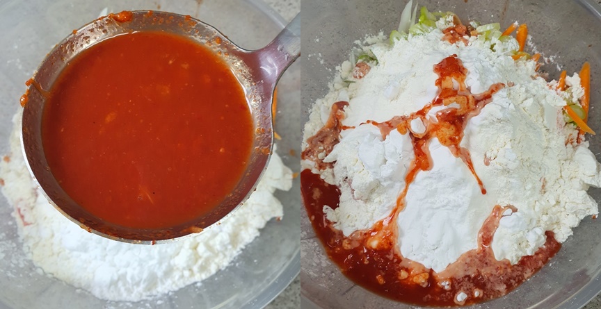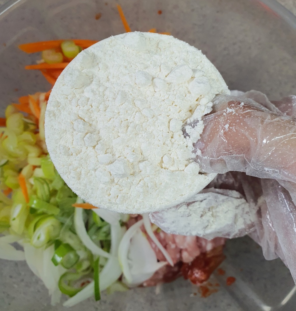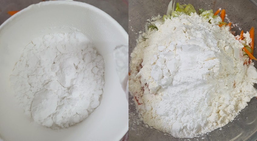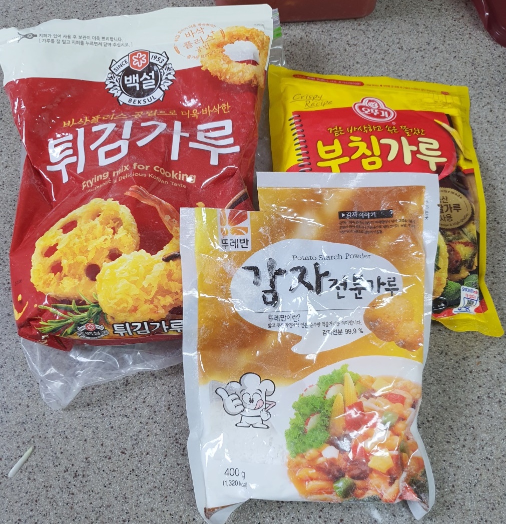 비율은 부침가루, 튀김가루, 전분가루 1:1:1/3 비율입니다.