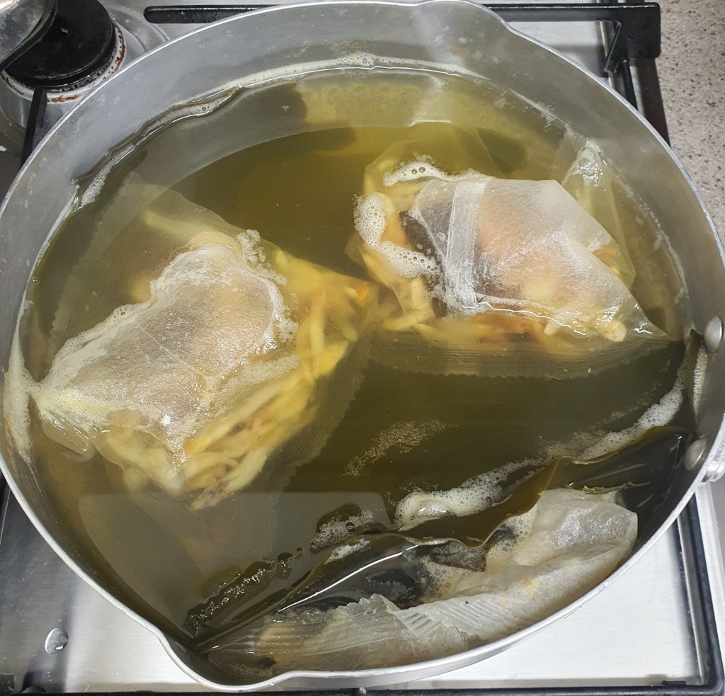 반죽에 사용할 멸치 육수를 진하게 우려냅니다.
