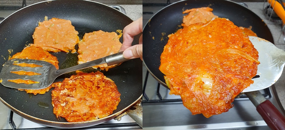 부칠 때는 뒤집개로 꾹꾹 눌러가면서