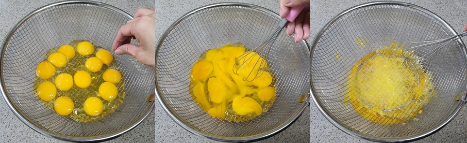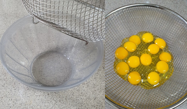 볼에 채반이나 바구니를 올리고 계란을 깨 줍니다.