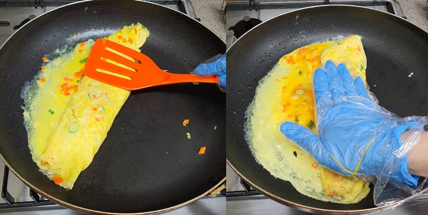 장갑을 낀 손이나 뒤집개로 눌러주면서 말아야