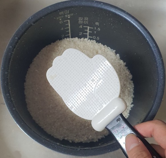 쌀에 물을 담고 솥을 기울여 내솥에 주걱이 닿지 않도록 착착착 쌀만 씻어주세요~