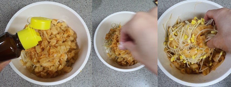 4) 그리고 식은 콩나물에 썬 김치를 넣고 참기름과 맛소금으로 간을 해 버무려 주세요.